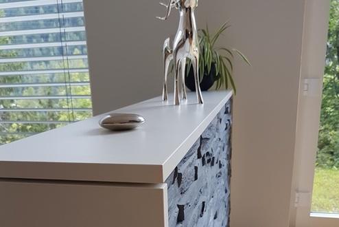 Dieses motorisierte Fernsehmöbel stellt eine wunderbare Kombination aus Holz und Stein dar. Das Lowboard wurde komplett weiss gehalten während der Fernseh sowohl vorne als auch hinten mit Naturstein verkleidet wurde. In dieser Kombination dient das Element auch als eleganter Raumtrenner. Im Lowboard gibt es die Möglichkeit DVD’s zu verstauen.