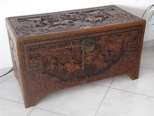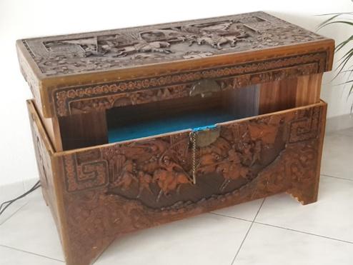 Von dieser Truhe wird kein High Tech erwartet – und dennoch haben wir diese mit einem Motor versehen und daher kann die Truhe auf Knopfdruck geöffnet werden. Somit wird ein rustikales Element mit einer praktischen Funktion aufgewertet.