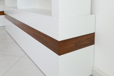 Dieses sehr lange motorisierte Sideboard besticht durch das unterbrechende Element des Nussbaumfrieses, welches die weisse Front unterteilt. Ein weiteres Detail ist die eingebaute LED-Schiene, welche den schwebenden Effekt des Sideboards unterstützt.
