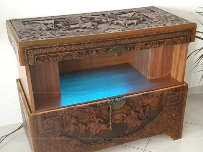 Von dieser Truhe wird kein High Tech erwartet – und dennoch haben wir diese mit einem Motor versehen und daher kann die Truhe auf Knopfdruck geöffnet werden. Somit wird ein rustikales Element mit einer praktischen Funktion aufgewertet.