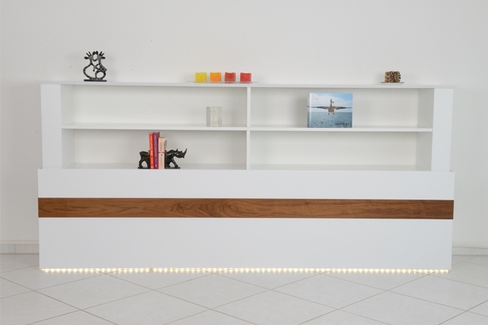 Dieses sehr lange motorisierte Sideboard besticht durch das unterbrechende Element des Nussbaumfrieses, welches die weisse Front unterteilt. Ein weiteres Detail ist die eingebaute LED-Schiene, welche den schwebenden Effekt des Sideboards unterstützt.
